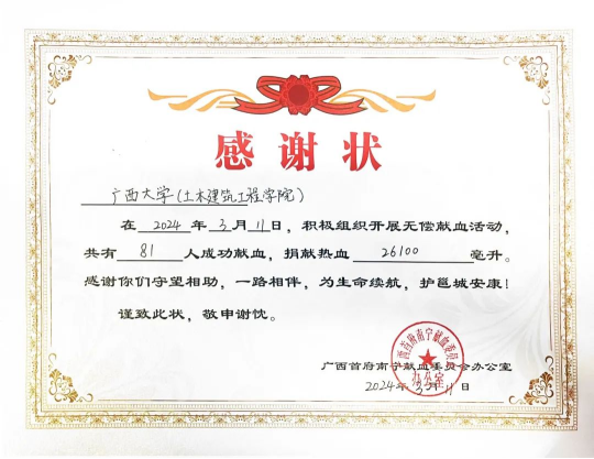 学院党委副书记银宁带头报名献血并表示:病魔无情,人间有爱,众多师生热心帮助同学,体现了土木学院一家亲,祝愿这位同学早日康复。其中一位热心献血的同学表示:这是人生中第一次献血,也是2024年以来做的最有意义的事情。南宁市中心血站和学生家长向我院发来感谢状并对大家表示感谢。