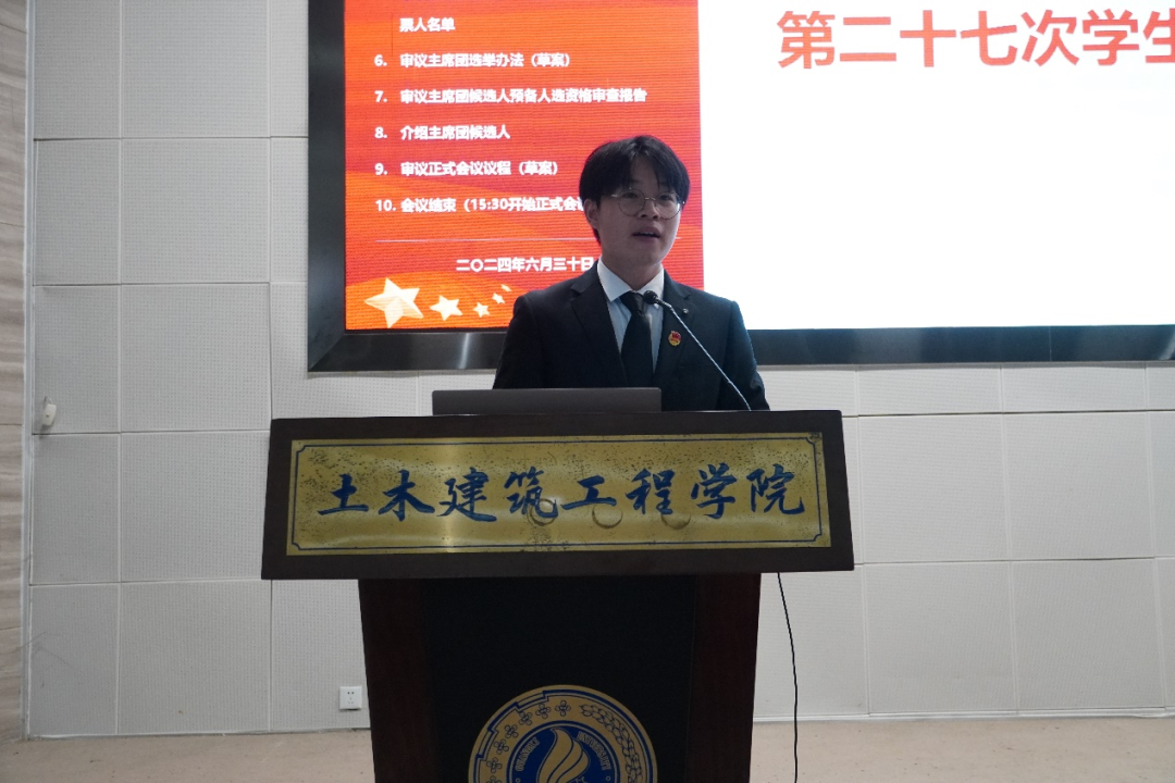 2024年6月30日下午,beat365手机版官网入口土木建筑工程学院第二十七次学生代表大会在土木建筑工程学院新结构试验平台第六报告厅顺利召开。学院党委副书记银宁,团委书记潘桂祯,团委副书记刘承诚,学工组谢雨真、何冉、陆源老师,我院各学生组织成员、各班级学生正式代表参加大会,各兄弟院系学生会代表应邀参加会议。会议由土木建筑工程学院第二十六届学生会执行主席梁芷萱主持。