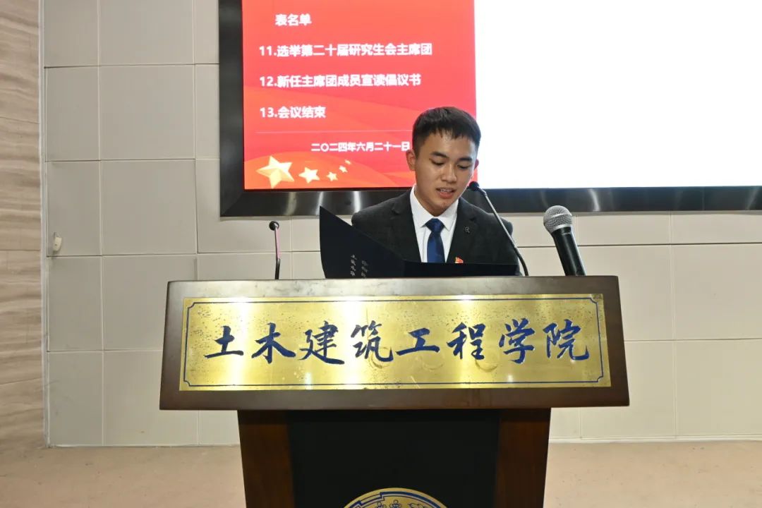 最后,新任研究生会主席团代表罗劲宣读《beat365手机版官网入口土木建筑工程学院第二十次研究生代表大会倡议书》,向全院青年学子发出倡议:以坚定远大的理想励志前行,以孜孜不倦的精神求索新知,以高尚美好的情操培育品德,以锐意创新的激情投身实践,以艰苦扎实的奋斗成就人生,将自身和国家结合,紧握新时代的接力棒,不负前辈期望、社会重托、国家希望,紧紧跟随党的前进步伐,全力为建功新时代而拼搏,为推进土木工程世界一流学科建设,为实现中华民族伟大复兴的中国梦奉献青春力量!