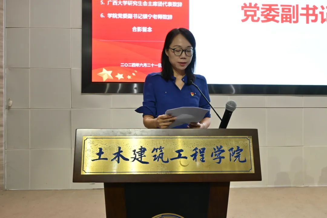 学院党委副书记银宁对大会的召开表示热烈的祝贺并对我院第十九届研究生会工作给予高度的肯定和赞扬。她对我院全体同学和新一届研究生会提出三点希望:一是勇立潮头,争做时代的奋进者。厚植爱国爱党情怀,传承弘扬红色基因,自觉把个人成长与社会需求相统一、把个人命运与国家发展相统一。二是奋发有为,勇做时代的开拓者。勇于解放思想、与时俱进,敢于上下求索、开拓进取,拥有在继承中超越的雄心壮志,服务学院,贡献社会。三是心系家国,敢做时代的奉献者。以“高效办成一件事”为牵引,涵养“时时放心不下”的责任感,强化“事事心中有底”的行动力,提振“为人民做奉献”的精气神。