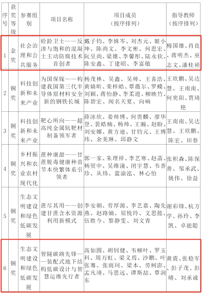 11月2日,由共青团中央、教育部、人力资源社会保障部、中国科协、全国学联、陕西省人民政府联合主办,由西安交通大学、共青团陕西省委承办的第十四届“挑战杯”秦创原中国大学生创业计划竞赛在西安交通大学落幕。经过激烈角逐,我院参赛项目《砼龄卫士——反渗与饱和的混凝土主动防腐技术首创者》从众多项目中脱颖而出,喜获金奖(全国共180项)。这是我院连续第二届荣获金奖,也是此次竞赛中广西壮族自治区获得的唯一金奖。同时,《智隧碳路先锋——装配式地下结构低碳设计与智慧运维先行者》项目获得铜奖,是我校获得的五个铜奖之一。