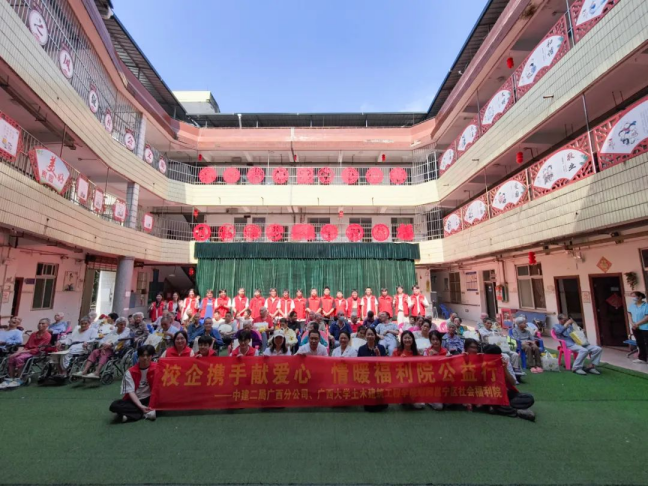 活动当天,我院党委副书记、纪委书记银宁、团委书记潘桂祯、团委副书记刘承诚,中建二局党委副书记赵勃、中建二局办公室主任周天哲及30余名学生志愿者走进邕宁区社会福利院,为老人们送去春日温暖。