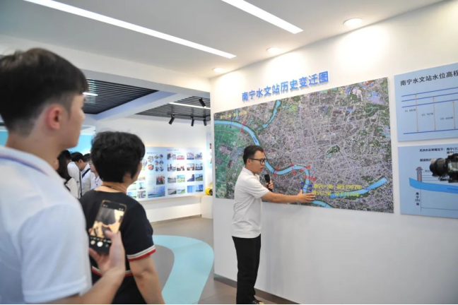 “南宁水文中心站是全区四个‘年水文站’的基层站点之一,也是第一批入选水利部的百年水文站,早在1907年就已有老一代水文人在邕江边开展水文测报工作。”在南宁水文中心站,南宁水文中心站副站长徐锋向同学们介绍了该站的发展历史及其在珠江流域治理中的重要作用。作为珠江流域西江水系郁江干流的重要控制站,南宁水文中心站是国家基本水文站,被誉为邕江防汛安全的守护者、邕江流域的“晴雨表”。长期以来,该站干部职工秉承“求精、务实、奉献、创新”的精神,加密监测值守、强化预测预报预警,为地方防汛抢险决策提供及时准确的水雨情信息和技术保障。