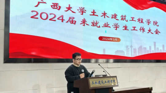 为帮助2024届毕业生明确就业方向,提高就业质量,3月19日上午,土木建筑工程学院在大型结构试验平台第六报告厅召开2024届未就业学生工作大会。学院党委副书记银宁出席并主持会议,中建三局国际公司人力经理牛滢,学院团委副书记潘桂祯,学工组老师陆源以及部分2024届毕业生参加了此次动员大会。