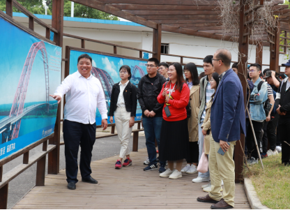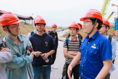 在项目安全总监廖汝锋带领下,老师和团员青年们登上平南三桥主桥桥面,参观工程建设现场,前往监控指挥中心智慧展厅,观摩现代化建设的科技手段。在主桥桥面,老师和团员青年们详细了解了项目地连墙和卵石层注浆工艺等施工关键技术及信息化建设情况。
