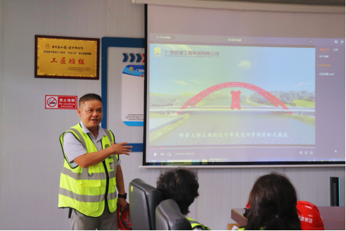 下午3点,调研小组抵达平果县那劳大桥工程及路网建设总承包(EPC)项目经理部。承建单位广西路建工程集团有限公司蓝经理结合项目相关视频与现场施工照片,向调研小组成员介绍了那劳大桥的工程背景及主要施工工艺。