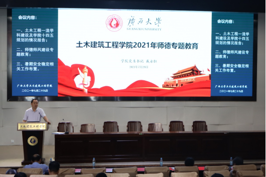 为贯彻落实《beat365手机版官网入口2021年师德专题教育实施方案》(西大〔2021〕5号),学院于7月29日在新结构大楼第六报告厅召开全体教职工会议,开展师德师风建设专题学习,学院党委书记戴永恒主持会议并作师德师风建设专题教育报告。