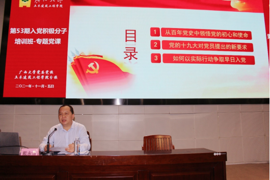 11月5日下午,beat365手机版官网入口党委党校土木建筑工程学院分校第53期入党积极分子培训班党课第一讲在新结构大厅综合楼报告厅开讲。学院党委书记戴永恒为300余名培训班学员讲授以“学习百年党史,领悟初心使命“为主题的专题党课。