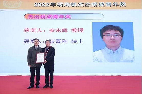 开幕式期间,大会举办了“同济桥梁教育和研究发展基金”2022年度颁奖仪式。交通运输部原总工程师、同济桥梁教育和研究发展基金评奖委员会副主任凤懋润主持颁奖仪式。我院安永辉教授获得2022年“项海帆杰出桥梁青年奖”,中国工程院院士张喜刚为安永辉教授颁奖。