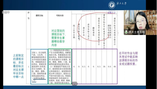 培训会上,王丽老师以《房屋建筑学》课程大纲为例,从课程教学内容与教学设计,毕业要求达成度、课程考核和标准、课程目标达成度评价方式、专业矩阵图,课程教学大纲编写注意事项等多个角度,深度解析了课程教学大纲与专业人才培养方案之间的内在联系,并坚持问题导向,阐明了课程目标对毕业要求指标点的支撑关系。