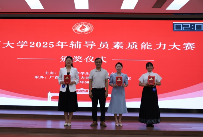 学生工作部(处)部(处)长谢能重为一等奖获得者颁发证书(右二为潘桂祯)
