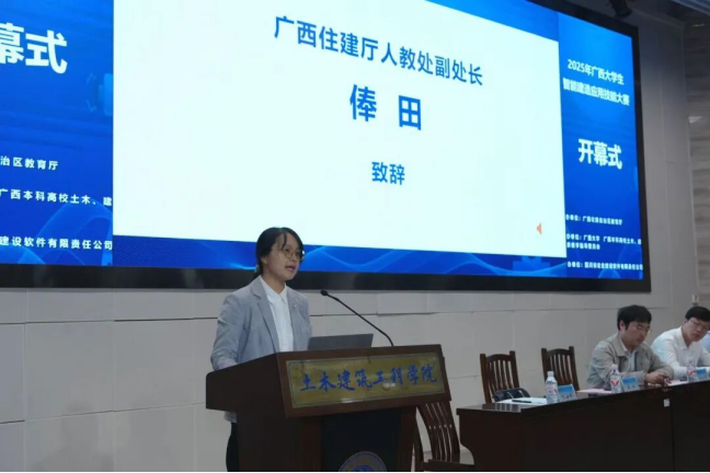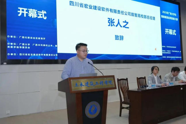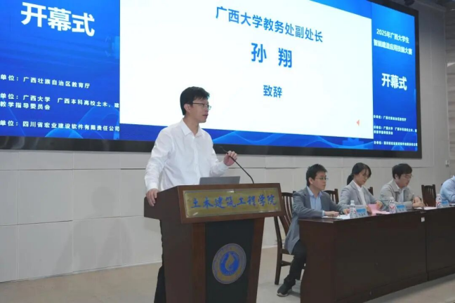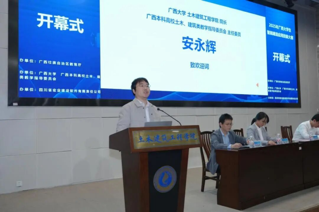 广西住建厅人教处副处长俸田、beat365手机版官网入口教务处副处长孙翔、beat365手机版官网入口土木建筑工程学院院长安永辉及四川省宏业建设软件有限责任公司数智高校部总经理张人之先后致辞。