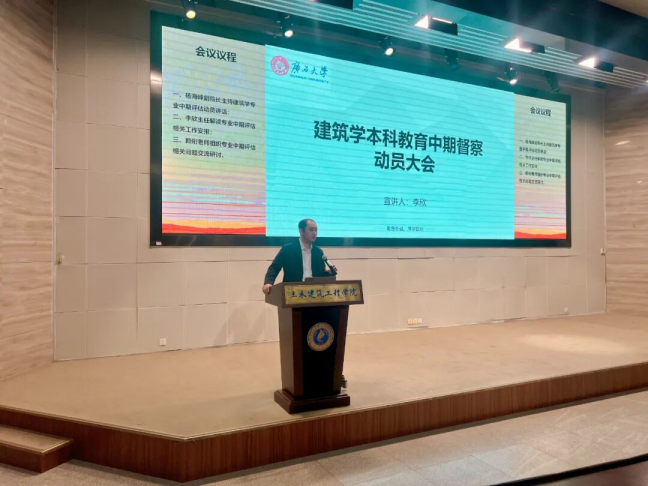 为全面落实专业建设要求,扎实推进建筑学专业中期评估筹备工作,明确评估任务、凝聚师生共识,2025年11月18日下午,学院建筑学专业中期评估动员会在第六报告厅顺利举行。学院分管教学副院长杨海峰、教学改革与专业建设部部长肖良、建筑规划系主任李欣,建筑规划系全体教师、建筑学专业班级辅导员及2021级至2025级建筑学专业全体本科生齐聚一堂,共同为建筑学专业高质量通过中期评估凝心聚力、共话发展。