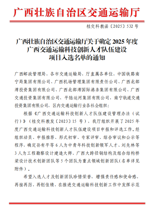 近日,广西壮族自治区交通运输厅公布2025年度广西交通运输科技创新人才队伍建设项目入选名单,我院2个项目成功入选。