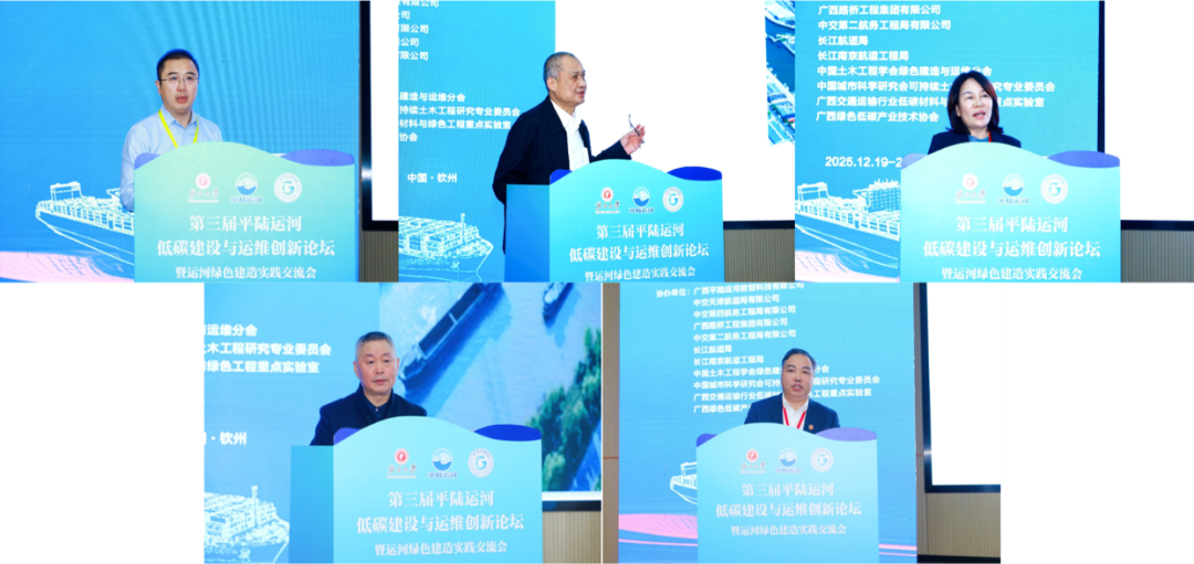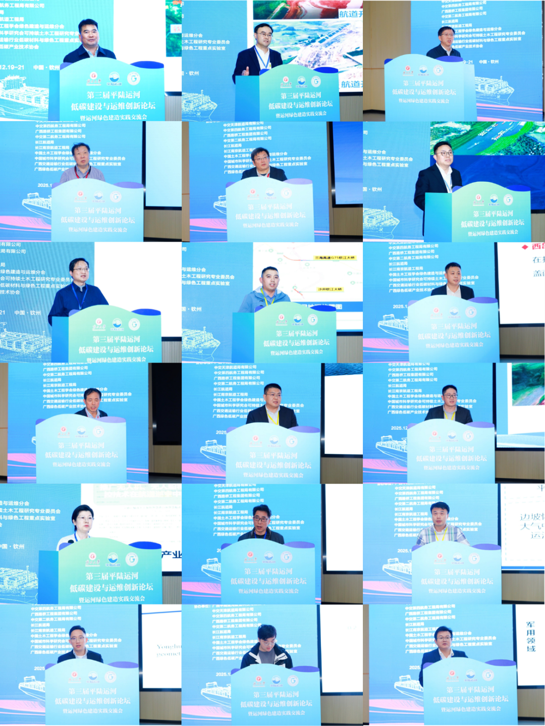 论坛组织了5场大会报告以及18场特邀报告,来自平陆运河集团有限公司、中交水运规划设计院有限公司、华北水利水电大学、重庆交通大学、beat365手机版官网入口、平陆运河建设有限公司、中交疏浚技术装备国家工程研究中心、湖南大学、广西交通设计集团有限公司、广西人工智能学院、广西路桥工程集团有限公司、广西产业技术研究院、黄河勘测规划设计研究院有限公司、广西路建工程集团有限公司、中交天津航道局、中交第四航务工程局有限公司、长沙理工大学等17家单位的专家学者围绕运河绿色建造前沿技术、低碳运维模式、低空经济、智能化监测与管理等多个主题分享了最新研究进展和工程实践经验,为现代运河绿色建设与运维提供了创新路径,也为未来现代运河的高质量发展提供了重要参考。