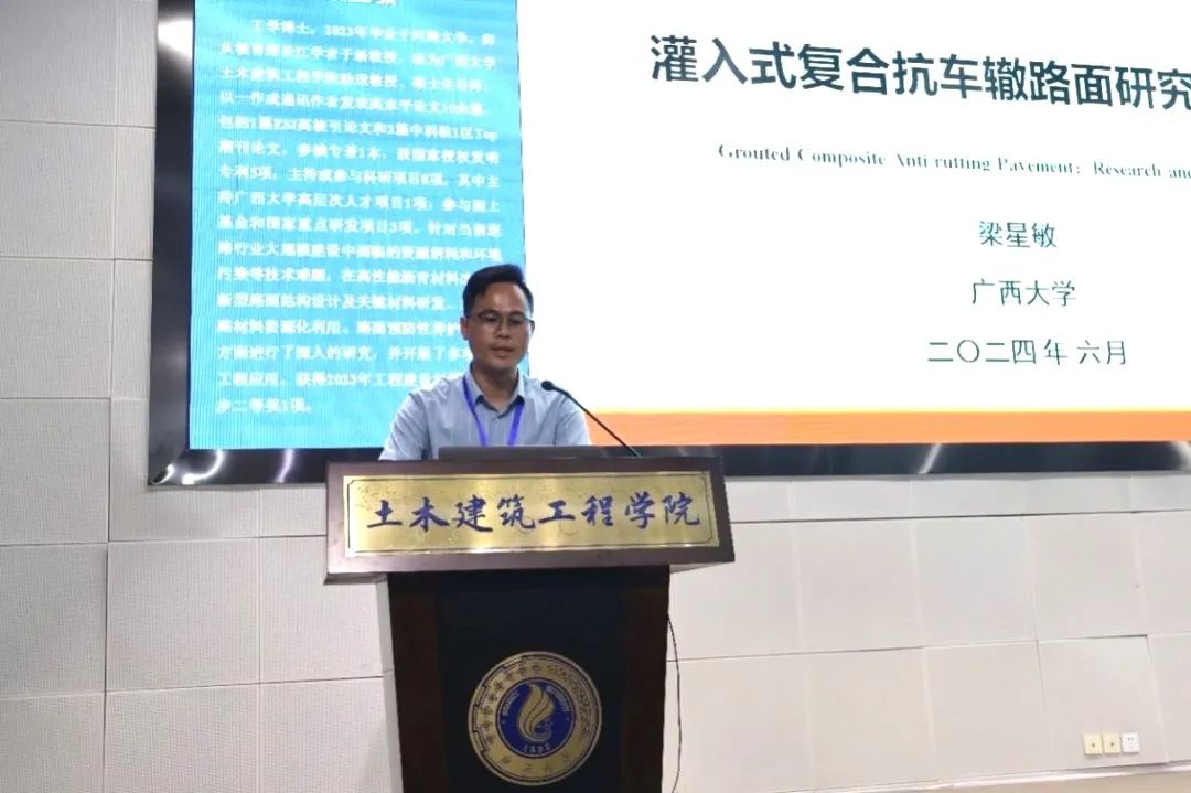 beat365手机版官网入口土木建筑工程学院助理教授梁星敏作了题为“灌入式复合抗车辙路面研究与应用”的学术报告,介绍了我国道路养护现状和车辙病害问题。梁星敏助理教授从非均质三相细观结构特征、复杂界面力学性能和微观结构、断裂力学行为以及路用性能等多方面研究了灌入式复合路面技术,结合实体工程进行了现场应用,验证了灌入式复合路面技术在解决车辙病害问题的广阔前景。