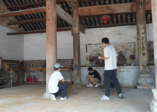 寻“影”乡村,在一砖一瓦间寻淳朴乡风。福溪村位于广西贺州市富川瑶族自治县,坐落在秦汉潇贺古道线上,被评为中国历史文化名镇名村,村中的百柱庙、古戏台、马楚庙、钟灵风雨桥等被列为全国重点文物保护单位。调研团在指导老师的帮助下,分工明确,协作细致,不仅对福溪村百柱庙、马楚庙、钟灵风雨桥及传统瑶族民居进行了全面细致的测绘,并通过图纸绘制展现瑶族古村落的建筑艺术及其文化内涵。